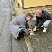 Am 9. November 1938 brannten in Deutschland die Synagogen, Geschäfte und Wohnungen jüdischer Mitbürger wurden von den Nazis verwüstet. Am 9 November 2025, dem Tag des Gedenkens an die Opfer des Holocaust reinigten der 1. Beigeordnete Rolf Meier und Stadtratsmitglied Jonah Klaus die Stolpersteine im Gau-Algesheimer Stadtgebiet. „Wir wollen auch dadurch das Erinnern wachhalten und dem leider wieder wachsenden Antisemitismus entgegentreten“ so Rolf Meier und Jonah Klaus. Begleitet wurden sie vom Landtagskandidaten Sebastian Hamann. Die Stolpersteine erinnern an die verschleppten